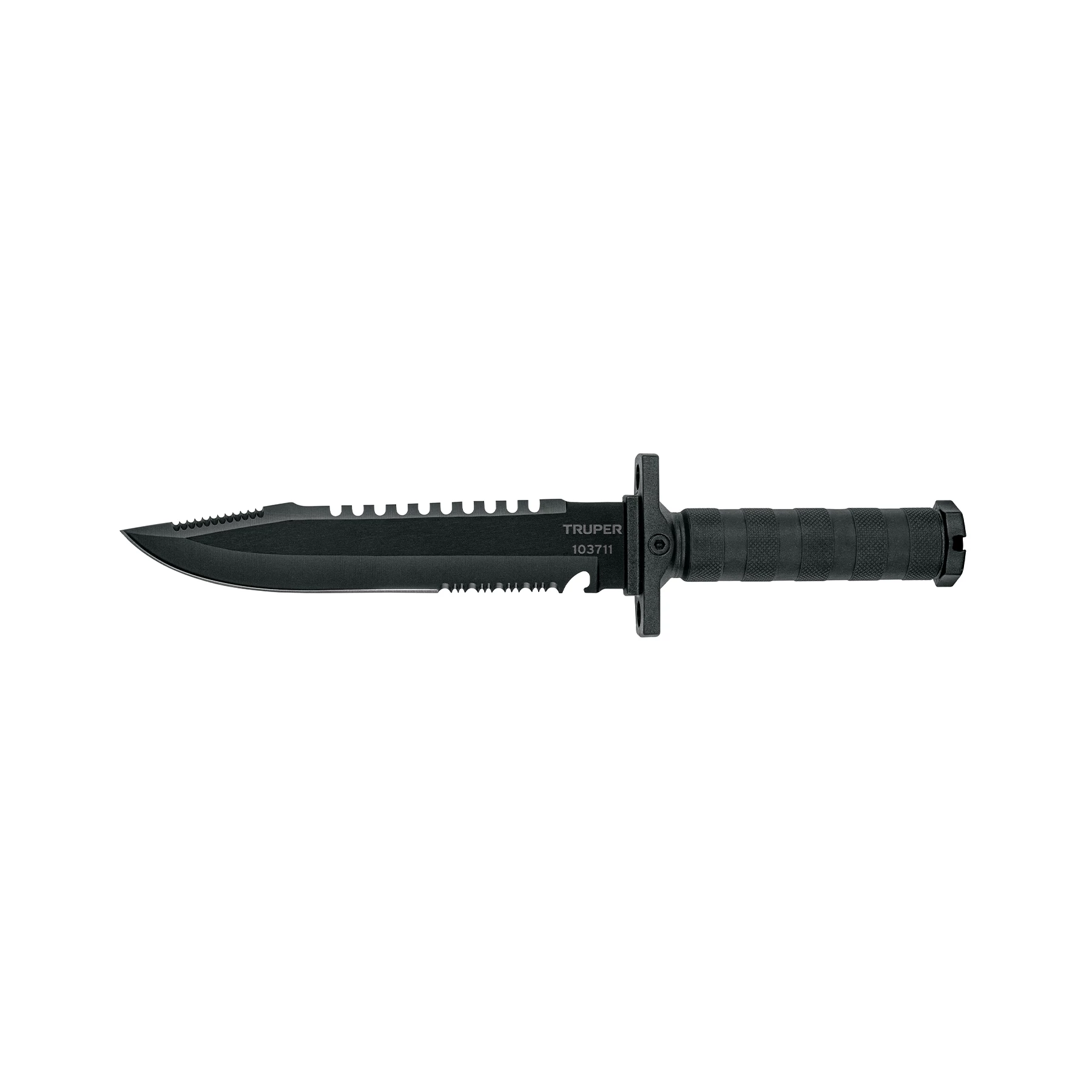 - Rozsdamentes acél penge (20cm) fekete bevonattal. Sima él, nyitó és szögletes fogak tépéshez vagy kaparáshoz